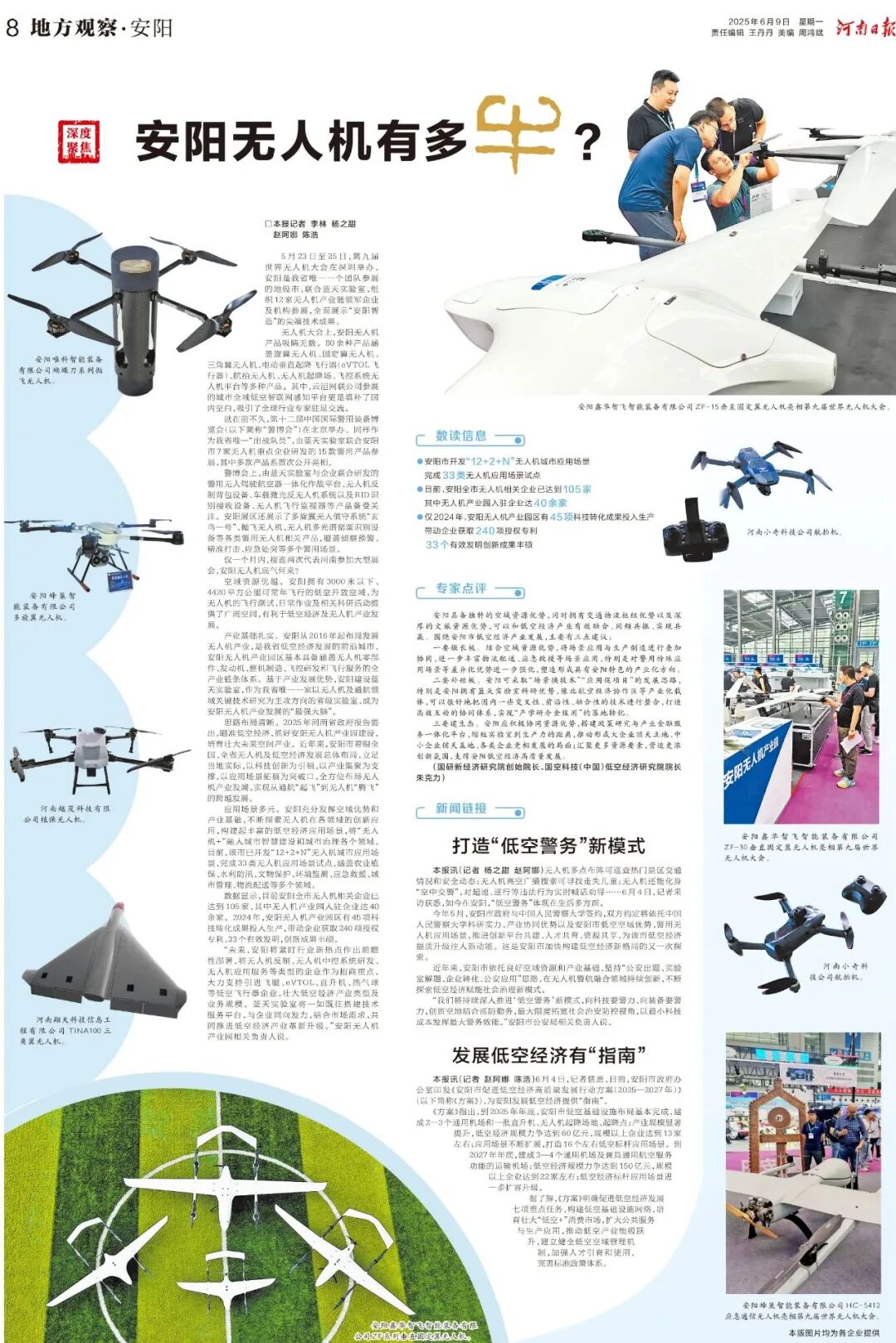 思路布局清晰。2025年河南省政府工作报告提出,瞄准低空经济,抓好安阳无人机产业园建设,培育壮大未来空间产业。近年来,安阳市着眼全国、全省无人机及低空经济发展总体布局,立足当地实际,以科技创新为引领,以产业集聚为支撑,以应用场景拓展为突破口,全方位布局无人机产业发展,实现从通航“起飞”到无人机“腾飞”的跨越发展。