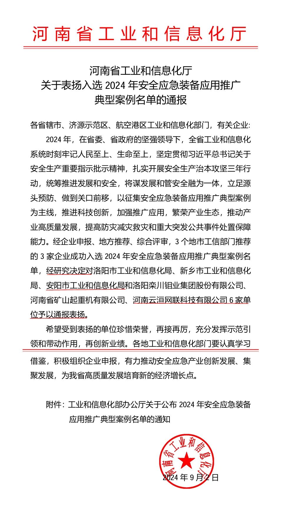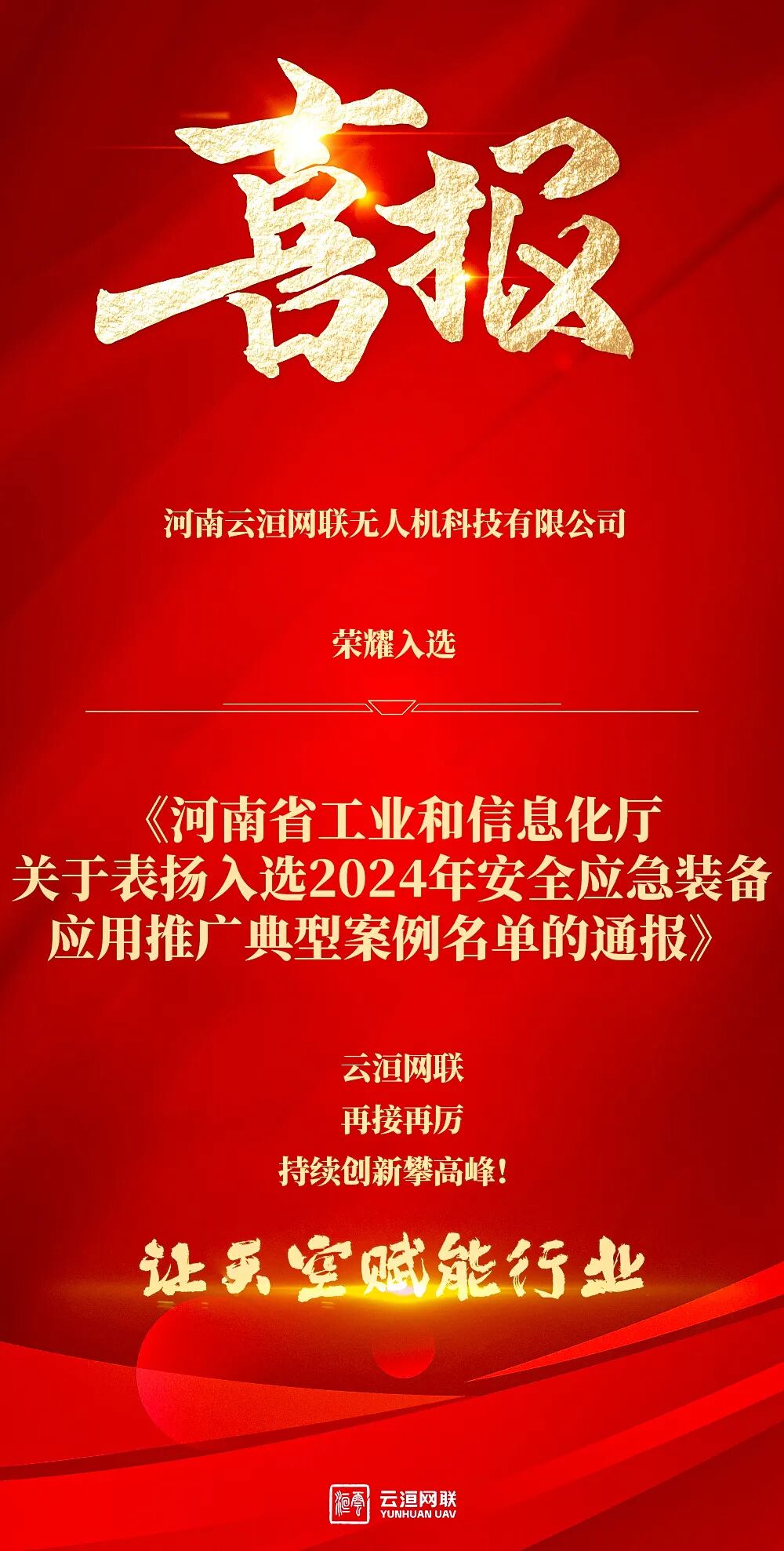 河南云洹网联无人机科技有限公司,凭借技术实力与创新应用,荣耀入选《河南省工业和信息化厅关于表扬入选2024年安全应急装备应用推广典型案例名单的通报》。