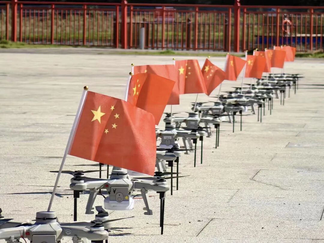表演开始前,工作人员邀请现场游客共同为无人机“托举”五星红旗,大家积极踊跃报名,领取手持五星红旗后在每架无人机上捆绑固定,再由工作人员进一步加固。
