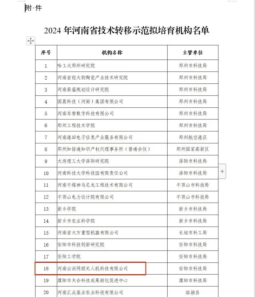 近日,河南省科学技术厅公示了2024年河南省技术转移示范机构拟培育名单,河南云洹网联无人机科技有限公司成功入选,认定为河南省技术转移示范机构。