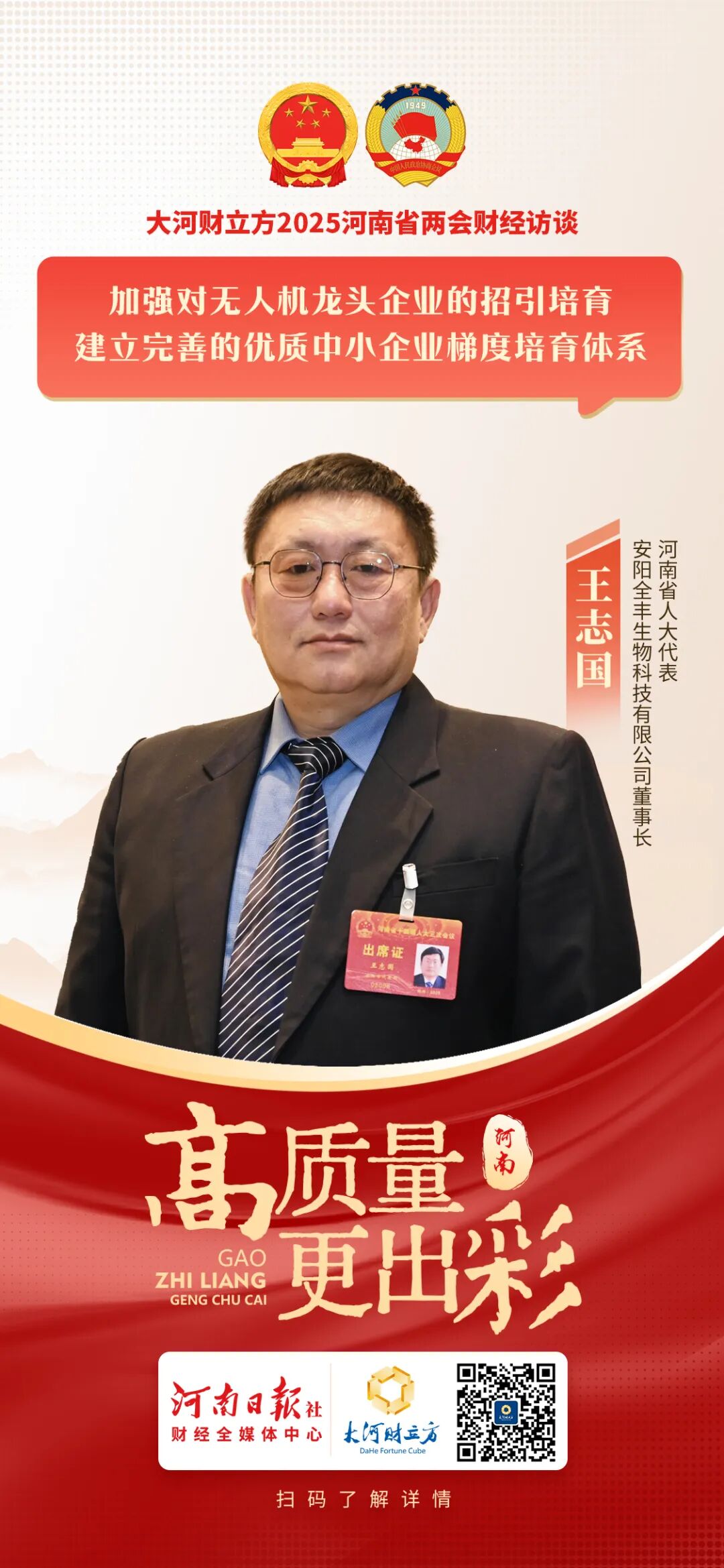 向天空寻发展,向低空要效益,低空经济正成为各地培育壮大新质生产力的新引擎。1月18日,河南省十四届人大三次会议开幕,省长王凯作政府工作报告。报告在部署2025年重点工作时提到,瞄准卫星及应用、低空经济等,抓好鹤壁卫星、安阳无人机产业园建设,培育壮大未来空间产业。安阳航空运动起步较早、享誉全国,被誉为“飞翔之城”。近年来,安阳抢抓低空经济发展机遇,充分挖潜低空经济资源禀赋,建成了全国首批民用无人驾驶航空试验区,全国首个5G泛在低空飞行测试基地、河南省无人机驾驶航空中试基地,河南省无人机质量检验中心、无人机飞行中心和5G无人机指挥控制中心,“一区两基地三中心”产业布局形成。2024年2月28日,聚焦低空经济重大科技需求的蓝天实验室在安阳成立。目前以蓝天实验室为引领,以无人机产业园为载体,安阳已集聚无人机相关企业100余家,搭建无人机应用场景30多个,输出全国规范性可执行标准成果14项,为全省低空经济发展注入了强劲动力。有优势,亦有短板。1月19日,省人大代表、安阳全丰生物科技有限公司(以下简称全丰生物)董事长王志国在接受大河财立方记者采访时表示,目前安阳低空经济发展仍处于蓄势待发的培育阶段,存在产业规模小、缺乏龙头企业、场景应用不足、科技研发能力不强等问题。“无人机产业园目前入驻企业多为初创型企业和发展期企业,缺少无人机产业头部企业的带动,企业数量在中部地区具备优势,但与深圳、成都、西安等产业发达地区仍存在较大差距。依托首批国家民用无人驾驶航空试验区建设成果,安阳持续深化城市应用场景,目前已开发了水利巡检、文物保护、应急救援等14项无人机城市应用场景,农业应用场景也在不断扩大,从农田无人机打药、施肥、播种,到果树用无人机打药,但无人机外卖配送场景、应急医药和器材运输场景等常态化应用和点位拓展仍有很大提升空间,对低空经济的带动作用还不突出。”王志国表示。对此,王志国将一份《关于支持安阳市北关区无人机产业发展的议案》带上了河南省两会,他建议相关政府部门加大对安阳市无人机产业发展的扶持力度。“例如,加强对无人机龙头企业的招引培育,建立完善的优质中小企业梯度培育体系,结合警用无人机生产和应用市场特点,出台相应奖补政策支持,与全国市场份额和技术优势明显的企业错位发展,扶持做大做强本地龙头企业;支持安阳无人机产业园招引细分领域龙头企业,支持申报专精特新企业,进一步扩大无人机产业规模。”王志国表示。王志国还提到,建议相关部门支持安阳举办无人机航展和无人机技术需求培训暨低空经济发展论坛,助力企业破解技术应用难题,发挥蓝天实验室在全省低空经济发展的技术牵引作用;支持依托安阳低空空域管理平台,建设全省低空空域管理服务平台;指导推动河南省无人机质量检验中心提高检验检测能力,创建国家级检测中心。据了解,全丰生物是一家集创新研发、原药生产、制剂复配加工、农用植保无人机研发生产销售、飞手培训、技术推广、标普飞防托管服务、内外贸易于一体的企业。为破解农业全程机械化瓶颈,2012年投资组建安阳全丰航空植保科技股份有限公司,是河南省农用植保无人机龙头企业,参与制定了河南省农用旋翼植保无人机安全及作业规程、农用旋翼植保无人机技术条件地方标准,2016年被推荐为国家航空植保科技创新联盟理事长单位。